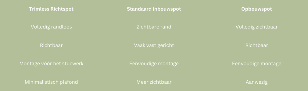 Twijfel je tussen trimless richtspots, standaard inbouwspots en opbouwspots? Wij hebben de belangrijkste verschillen voor je op een rijtje gezet: