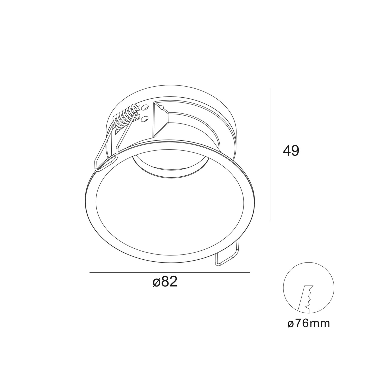 De montage van de spot is eenvoudig. In het plafond moet een gat worden gemaakt van Ø 76 mm, dit is een universele maat waar veel gatenboren voor in omloop zijn. Vervolgens wordt de spot geplaatst en deze klemt zich vast met de veren aan de achterzijde.