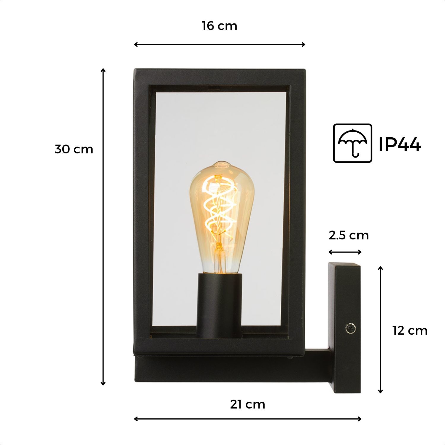 Het monteren van de lamp is eenvoudig met de bijgeleverde montageplaat. Door middel van 2 schroeven in de muur kun je de lamp bevestigen op een door jou gekozen plek. De buitenlamp is voorzien van een E27 fitting. Tegenwoordig kun je hier een energie zuinige LED lamp in plaatsen, die functioneel en sfeervol licht geeft. In de afbeelding staat de DMQ Filament ST64 lamp (niet bijgeleverd). De lamp is geschikt voor binnen en buiten. De Boston lamp beschikt over de veiligheidsklasse IP44.