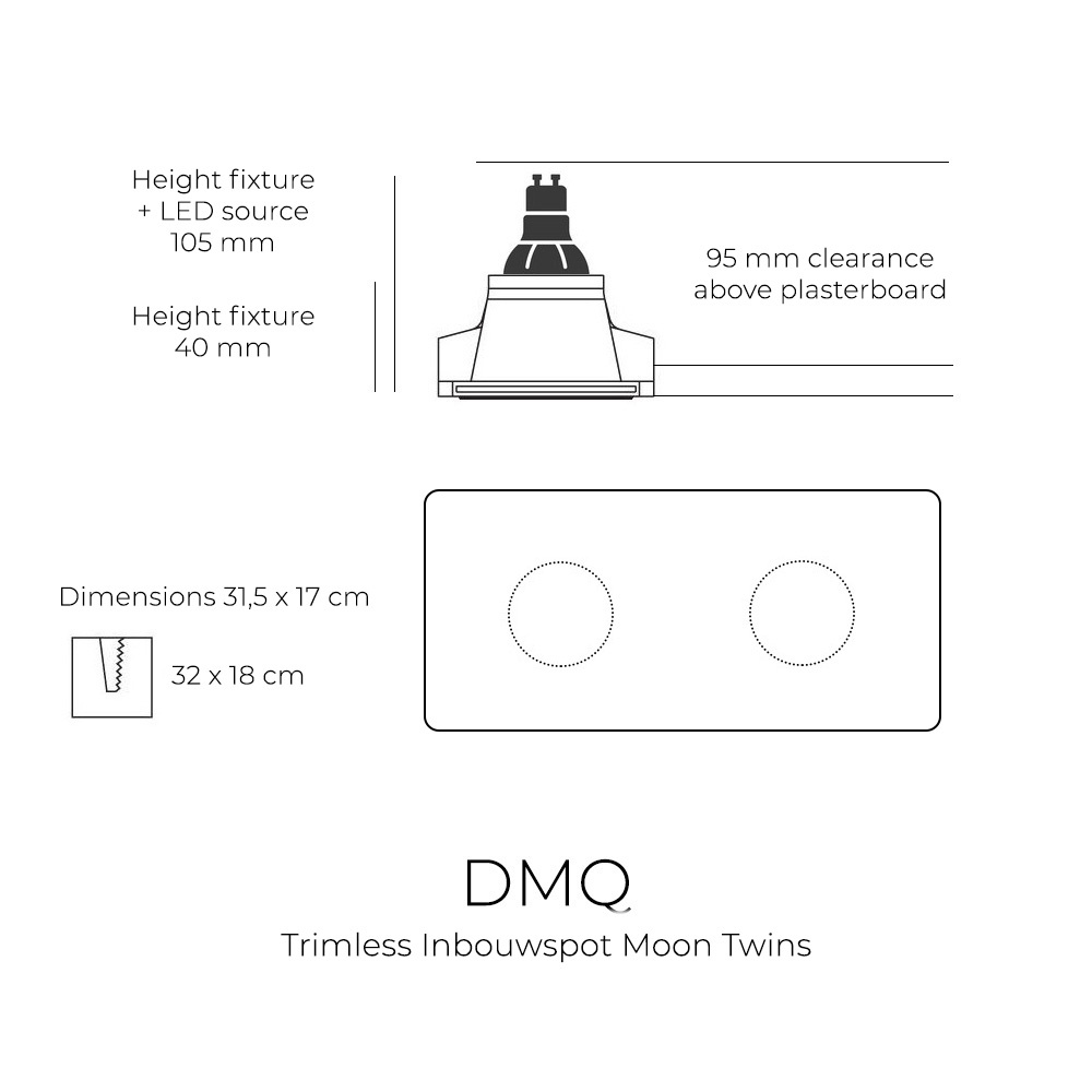 Voor de inbouw afmetingen kunt u de laatste afbeelding raadplegen. Voor de DMQ Moon is er 10,5 cm aan vrije ruimte boven het plafond nodig om de spot te plaatsen.
