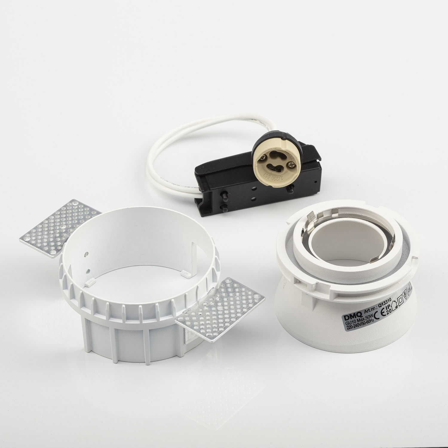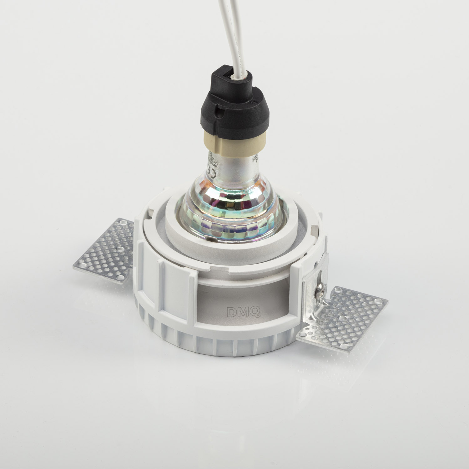 De spot bestaat uit 2 delen, het stucframe en het GU10 frame. Het stucframe dient verwerkt te worden in het plafond en kan tot 2 cm buiten het plafond gemonteerd worden (maximale laagdikte stuc 2 cm). Het GU10 frame zal na het stucen van onderaf in het stuc frame geklikt worden, hier bevestig je de GU10 lichtbron in.