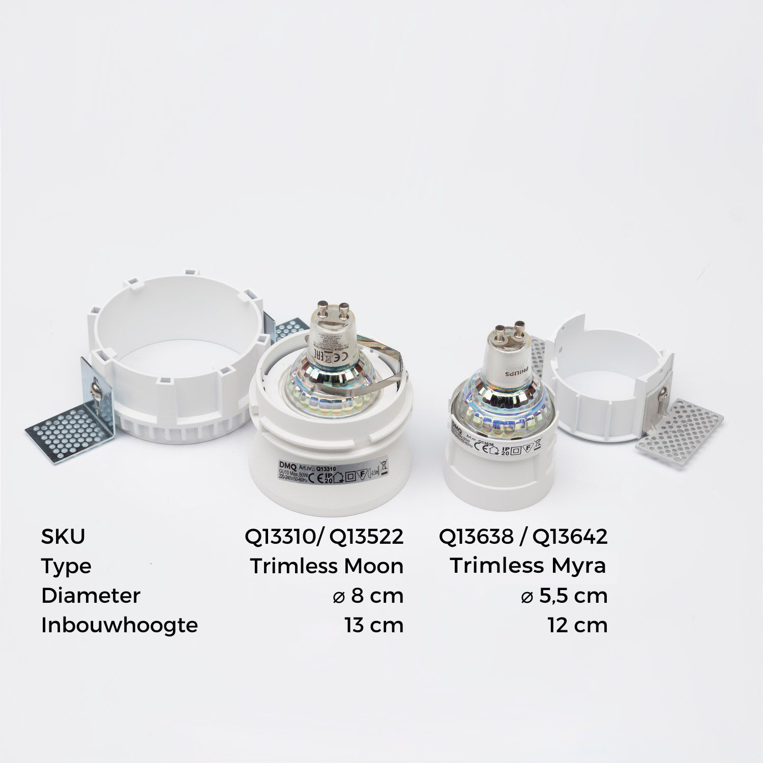 De Myra lijkt erg op onze populaire DMQ trimless Moon spot, enkel zit er een verschil tussen beide spots. De Moon versie is met zijn 8 cm diameter groter dan de 5,5 cm diameter van de Myra, hierdoor zal de Myra minder prominent aanwezig zijn in het plafond.