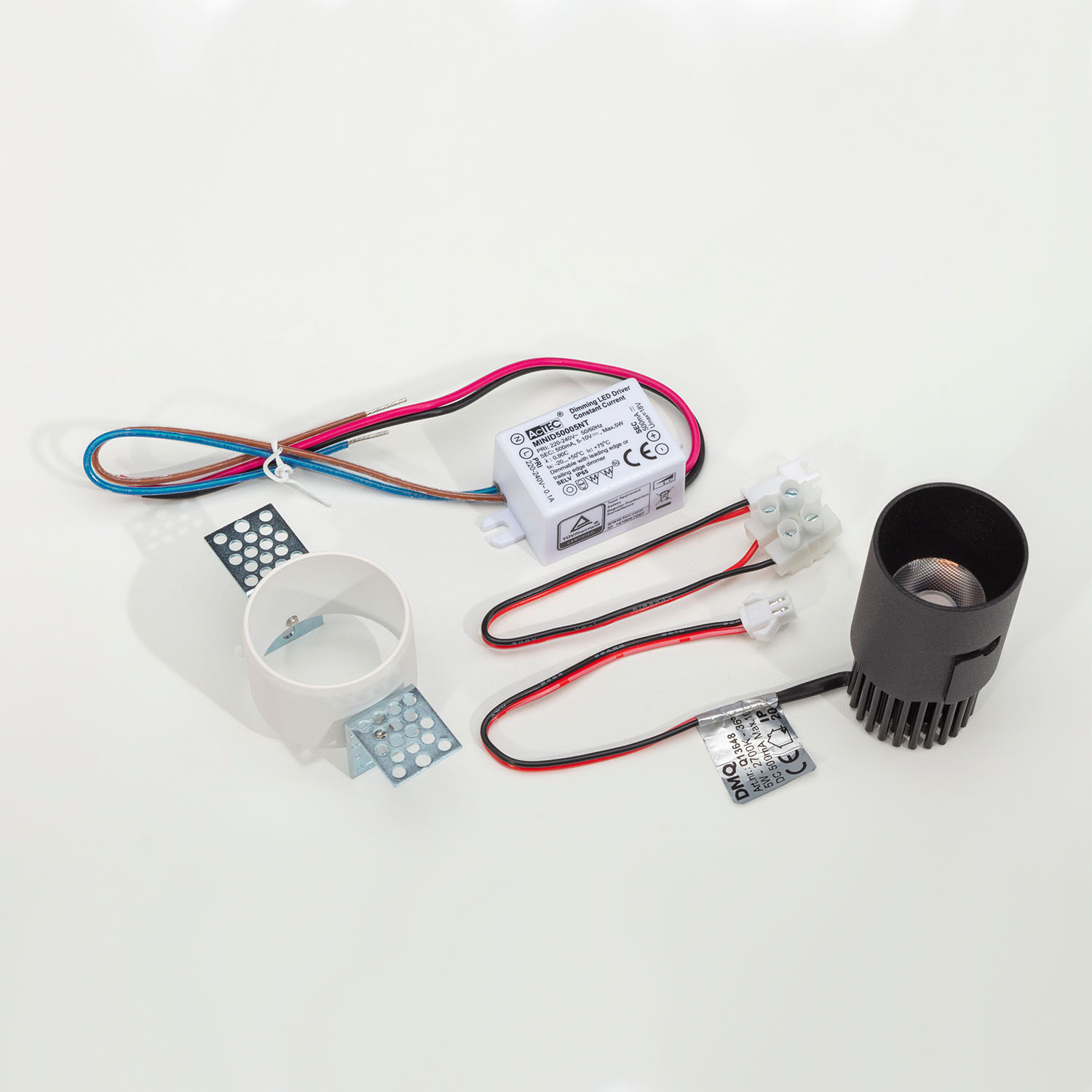 De spot bestaat uit 2 delen, het stucframe en de LED lichtbron. Het stucframe dient verwerkt te worden in het plafond (boorgat 45mm) en dient een paar millimeter uit steken, dit is af te stellen dmv de montagebeugels. Deze afstand wordt opgevuld door de stuclaag welke op het plafond komt, doe dit altijd in overleg met de stukadoor.