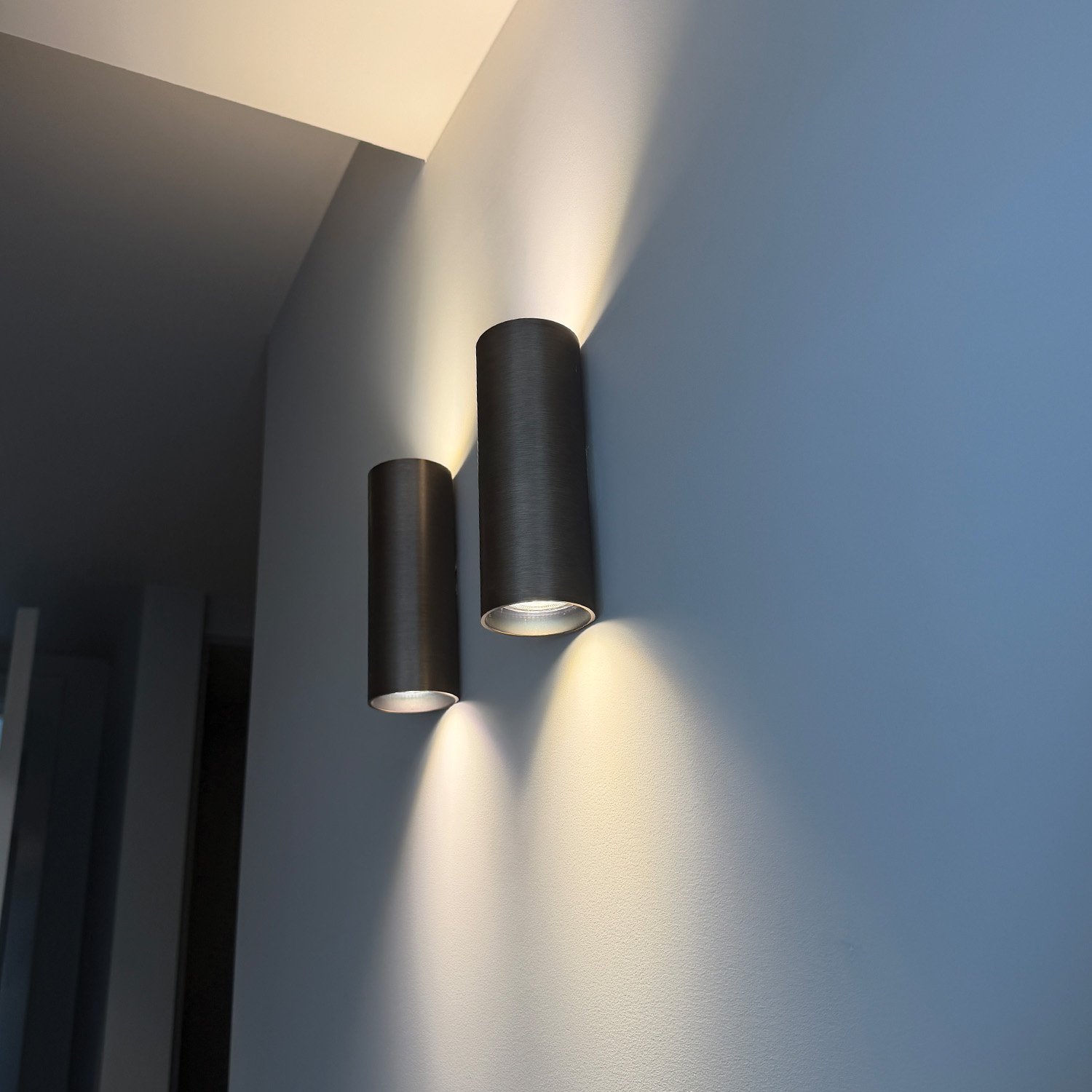 Met zijn geborstelde bronzen afwerking, cilindrische vorm en bijna trimless montage voegt de Bronte karakter toe zonder te overheersen. Het licht wordt zowel naar boven als naar beneden uitgestraald, wat zorgt voor een sfeervol wandeffect dat de ruimte subtiel accentueert.
